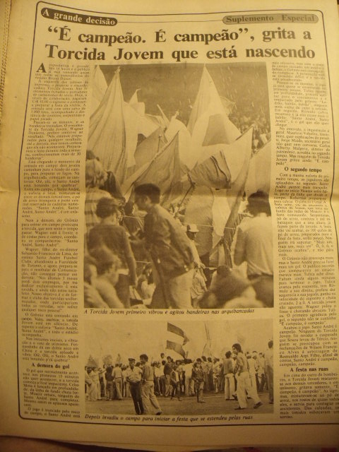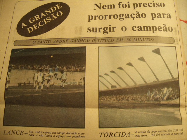 Recentemente chegou até minhas mãos um tesouro, algo que sem duvida não tem valor comercial para quem é apaixonado pelo ESPORTE CLUBE SANTO ANDRÉ, Trata-se se um complemento especial da pagina de esporte do Diário do Grande ABC, o maior jornal regional do país. São elas fotos e comentários sobre a primeira conquista do Santo André a A-2 de 1975 que garantiu o acesso do Santo André a elite do futebol Paulista.